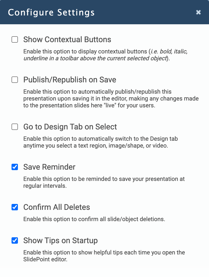 Enable this option to show helpful tips each time you open the SlidePoint editor.